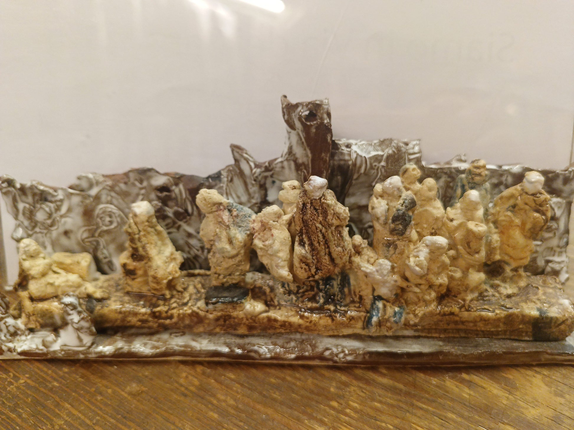 Opera realizzata a mano in ceramica e smalti. Dimensioni altezza 8cm, larghezza 23cm, profondità 4cm.