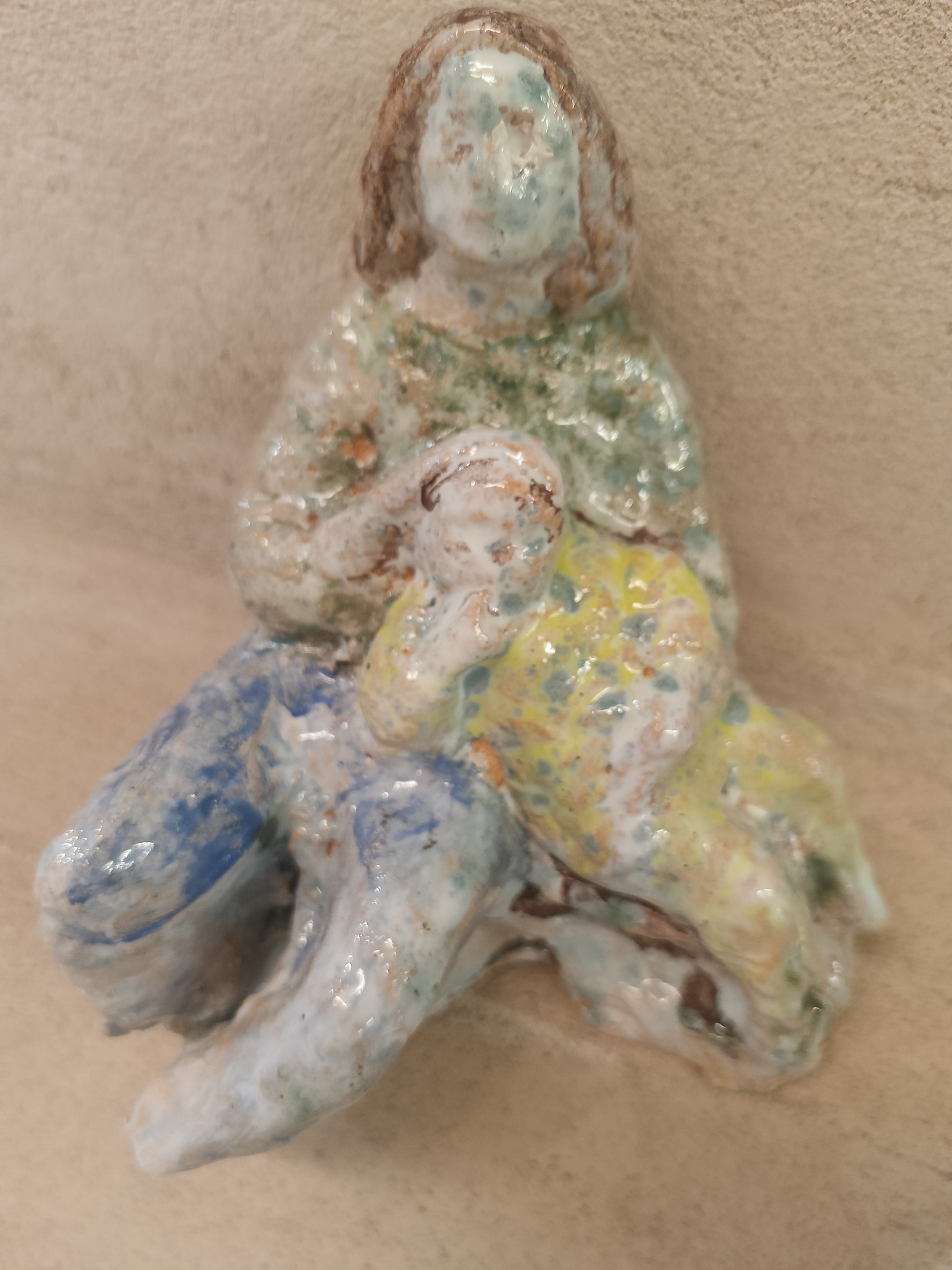Opera realizzata a mano in ceramica e smalti. Dimensioni altezza 13cm, larghezza 12cm, profondità 11cm.